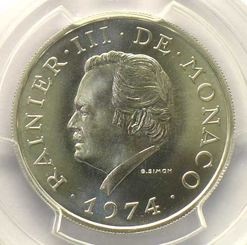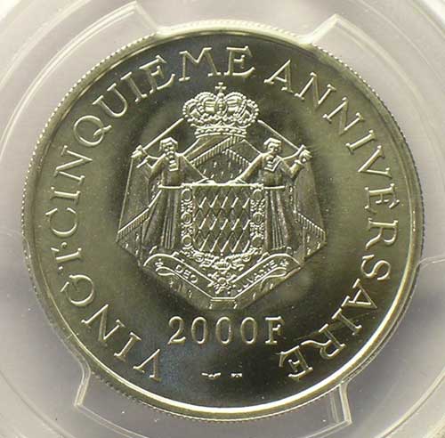 Coin in PCGS case no. 17296850 – Weight 19.98 g Pt 997 mill. Monaco Rainier III (1949-2005) G.170 2000 Francs