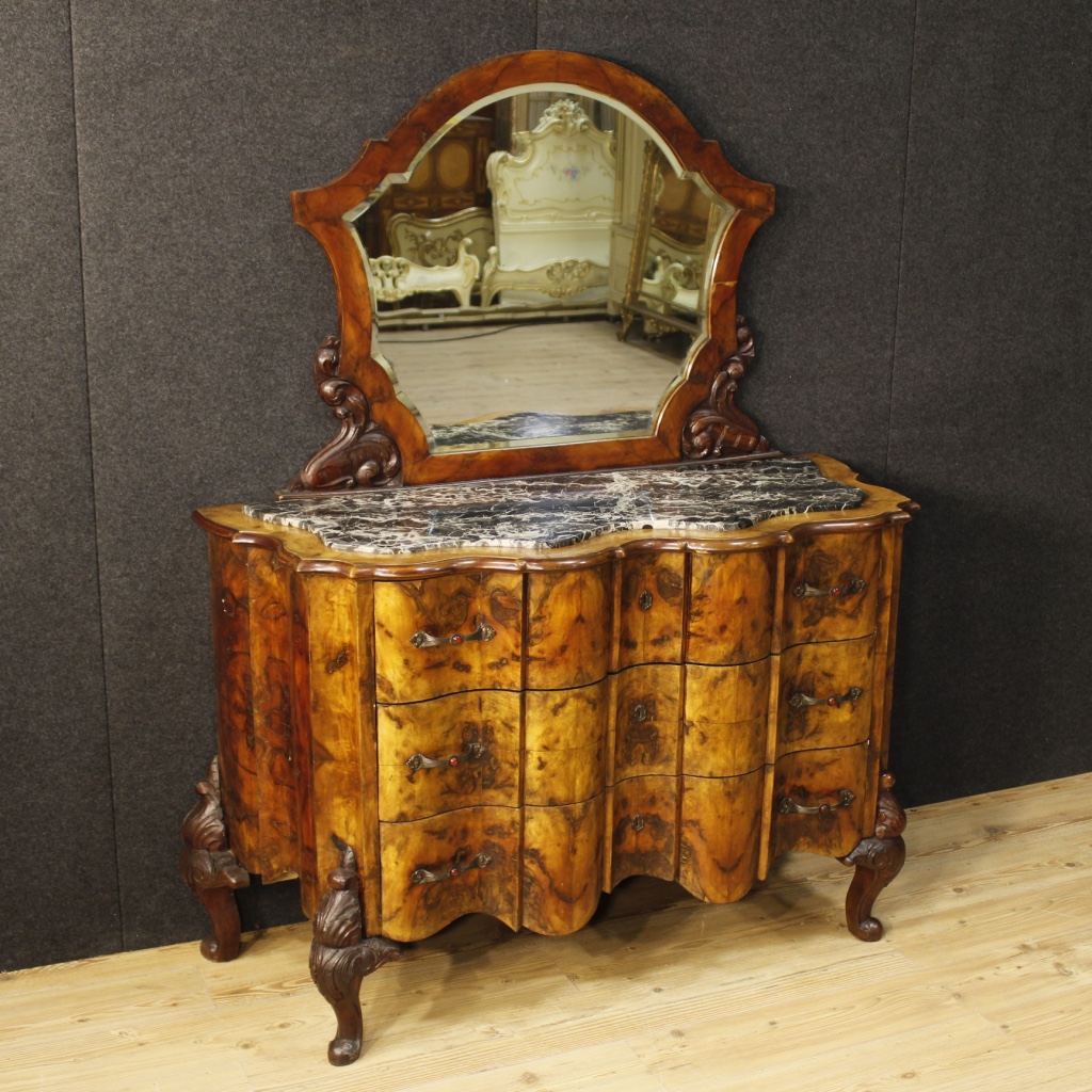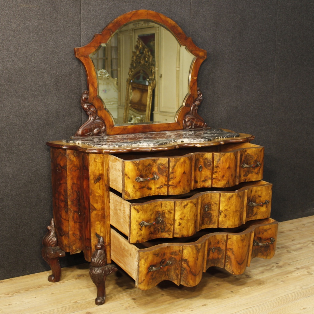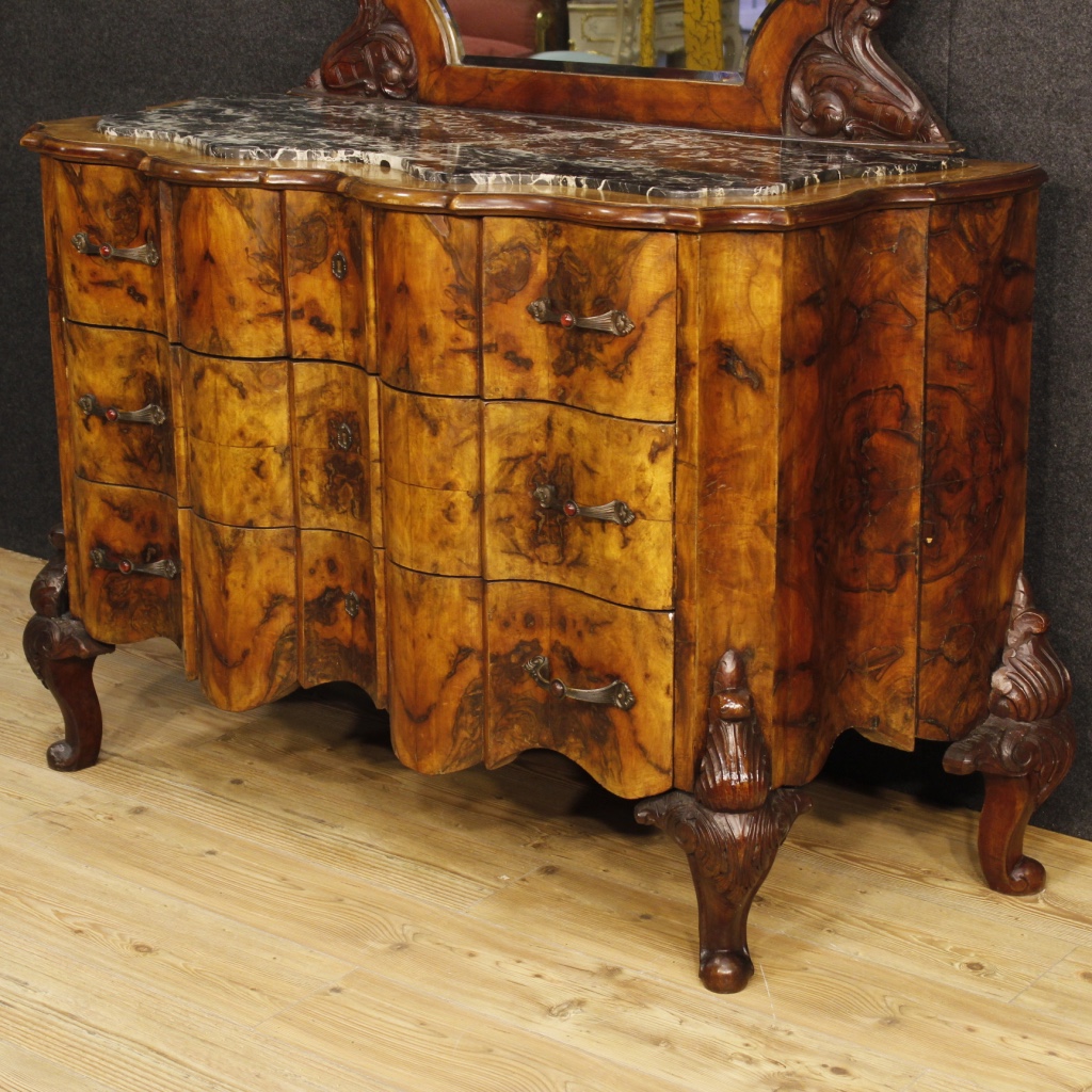 Italian chest of drawers with mirror from the mid-20th century. Furniture in carved walnut and burl walnut.