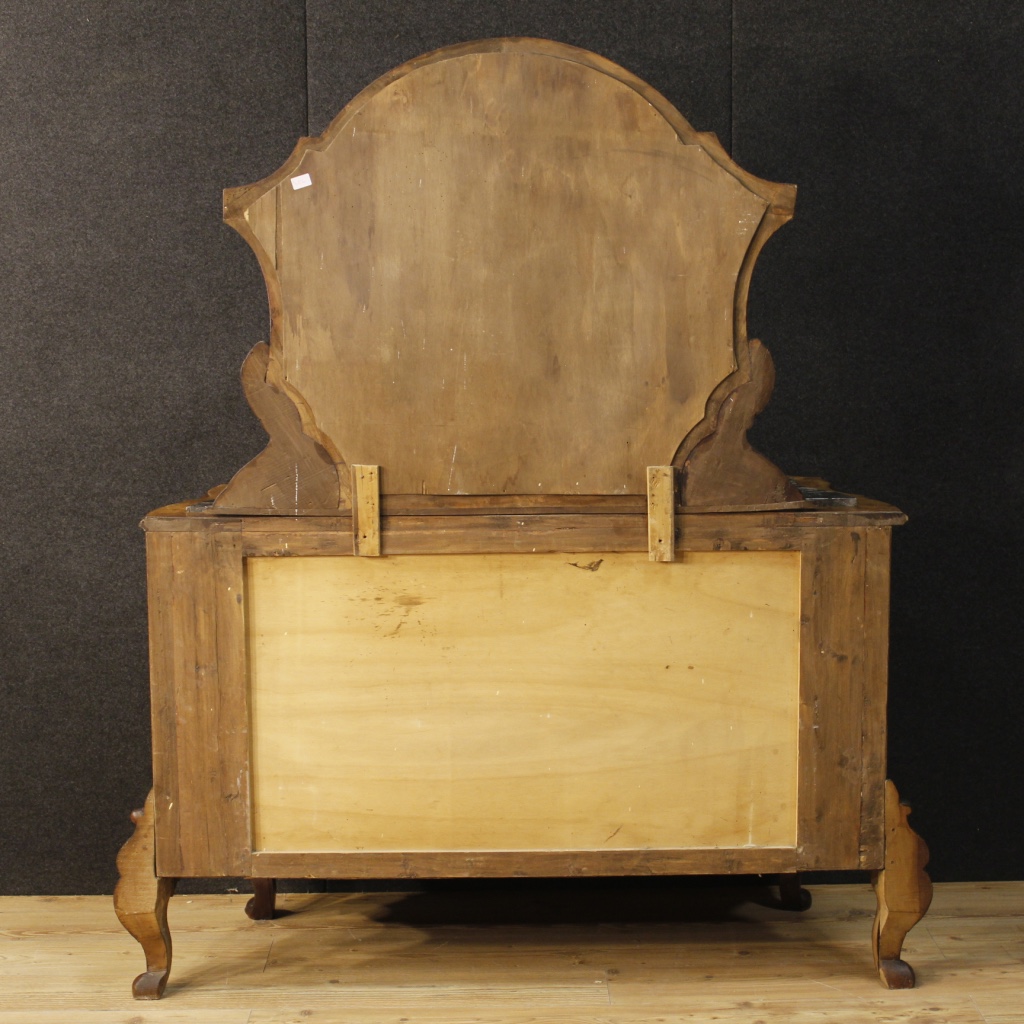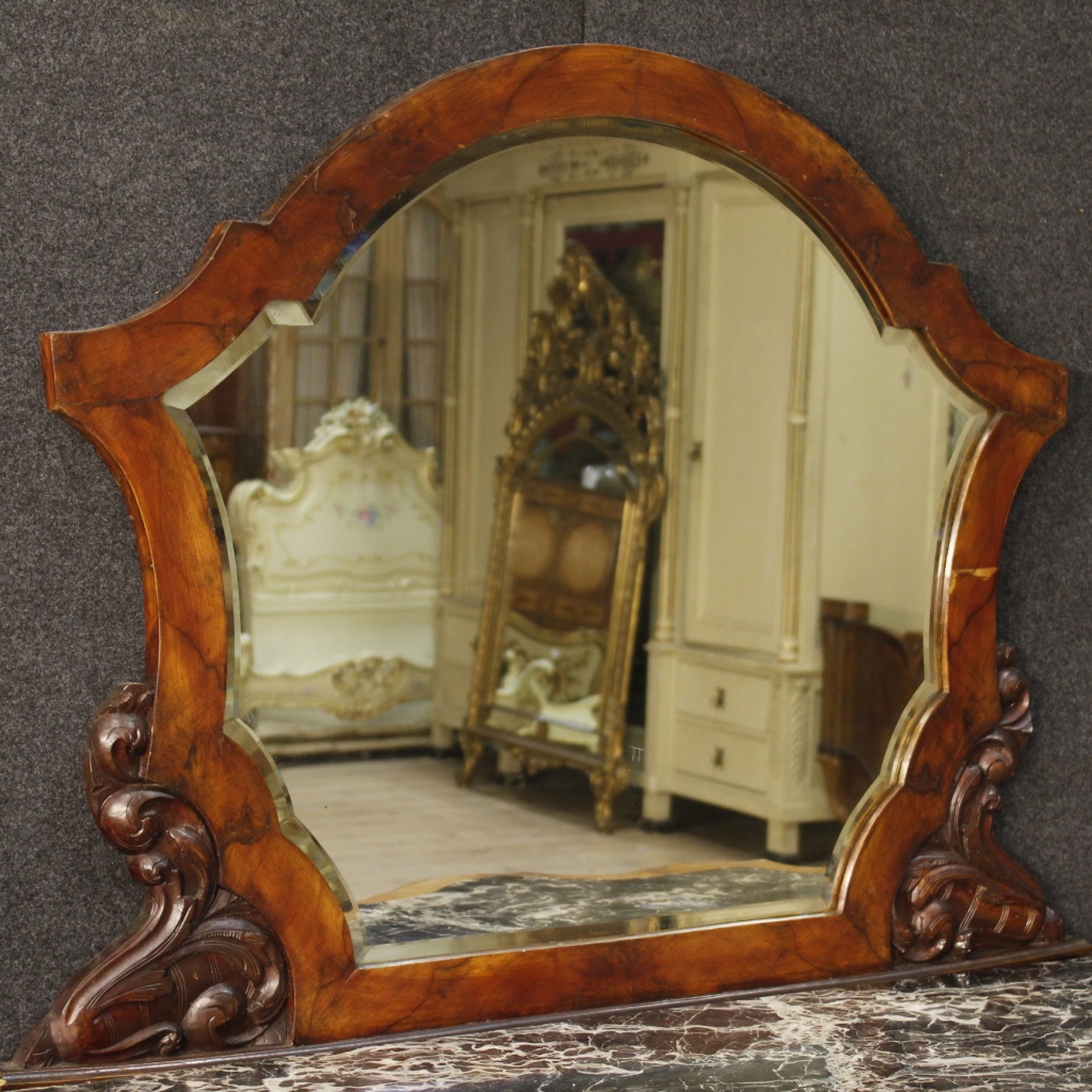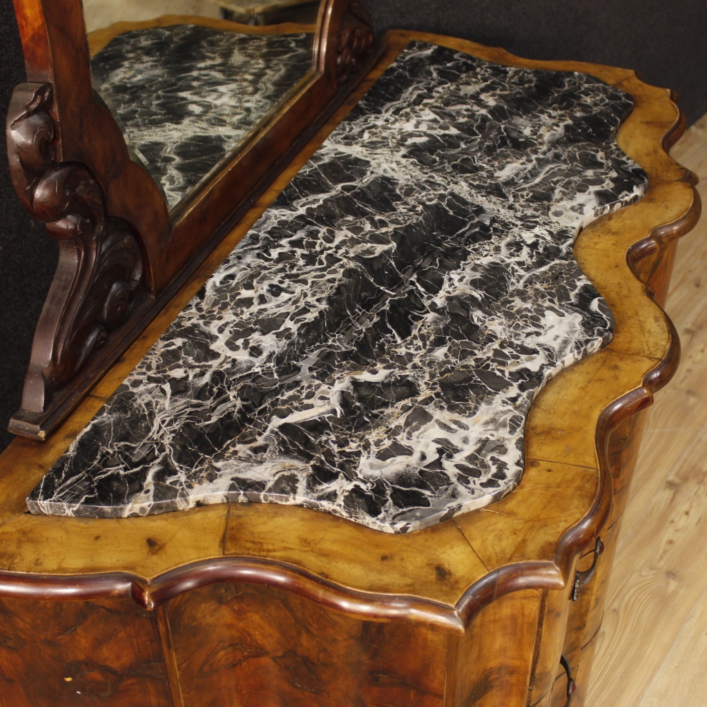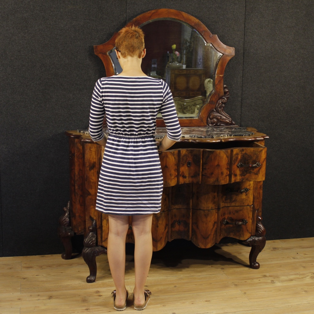 Italian chest of drawers with mirror from the mid-20th century. Furniture in carved walnut and burl walnut.