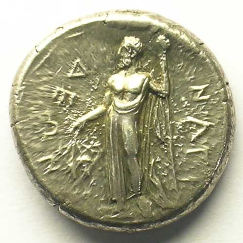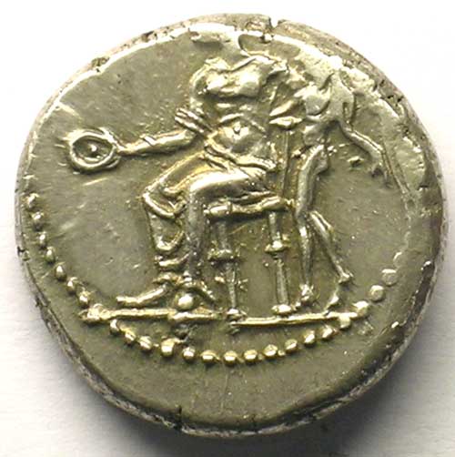 $ 4,745A / Aphrodite sitting left, holding a peg and crowned by Eros R / Dionysos Pogon standing to the left, holding a vine and a thyrsus –