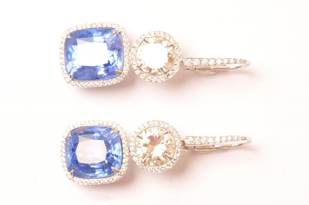 High jewelry earrings set with two sapphires totaling 27.78 carats, two diamonds totaling 4.65 carats and entourage diamonds of 0.90 carats in total.